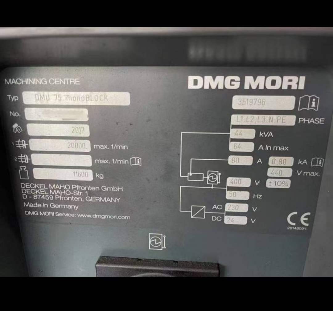 刚订下:一台全新少用德马吉DMU75五轴联动加工中心型号:DMU75monoBLOCK,2017年安装少用 750mmx650mmx560mm